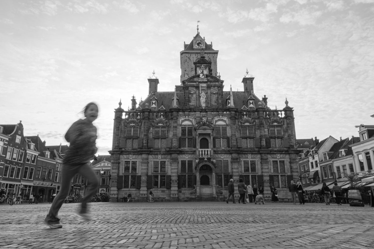 Kinderspaß vor dem historischen Rathaus in Delft.