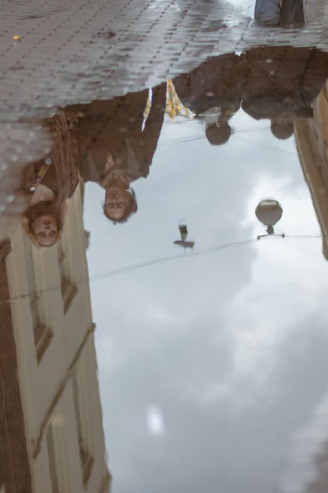 Begegnungen von Menschen spiegeln sich in einer Wasserpfütze.